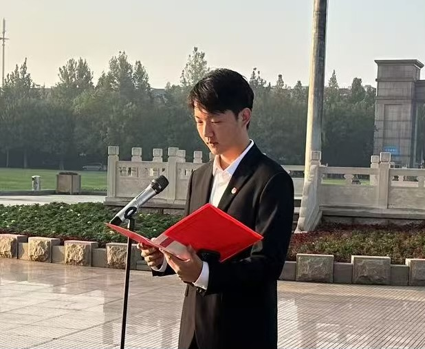 院学生会主席团成员闫喆做国旗下演讲。他结合自身学习和工作经历,分享了对于团结协作精神的理解与感悟,呼吁同学们要增强团队意识,在学习和生活中相互支持、携手并进,展现资源与环境工程学院学子良好的精神风貌。