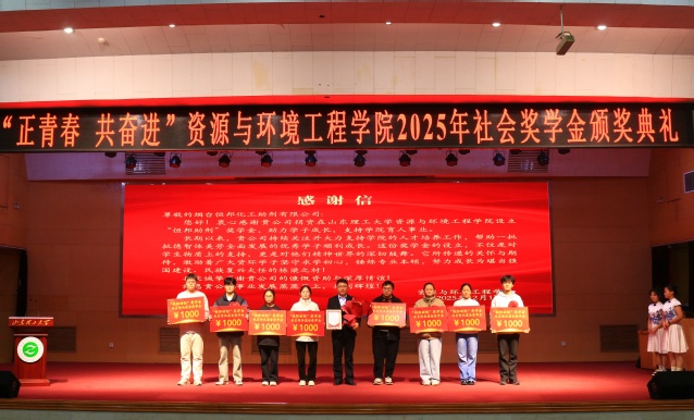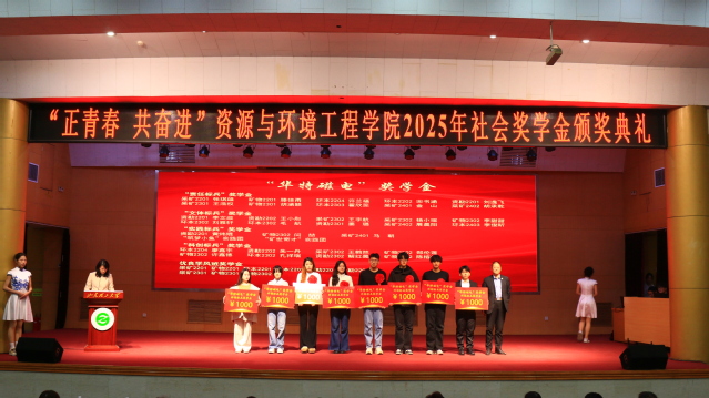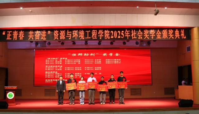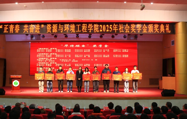 刘晓宣读了《资源与环境工程学院关于表彰2025年社会奖学金获奖集体和个人的通报》,秦伟伟依次介绍捐资助学企业概况和各企业在学院设立奖学金情况后,与会领导和嘉宾为获奖集体及个人颁奖。