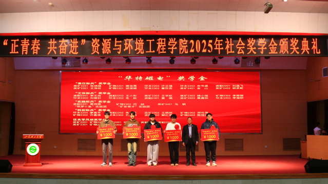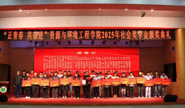12月17日晚,资源与环境工程学院在三号教学楼报告厅隆重举行“正青春 共奋进”2025年社会奖学金颁奖典礼,对在2024-2025学年中各方面表现突出的17个学生先进集体和58名个人予以表彰奖励,并为我校与招金矿业股份有限公司共同培养的62名招金金鹰班学生颁发“招金金鹰班”奖学金。校党委常委、副校长张守珩出席典礼并讲话。